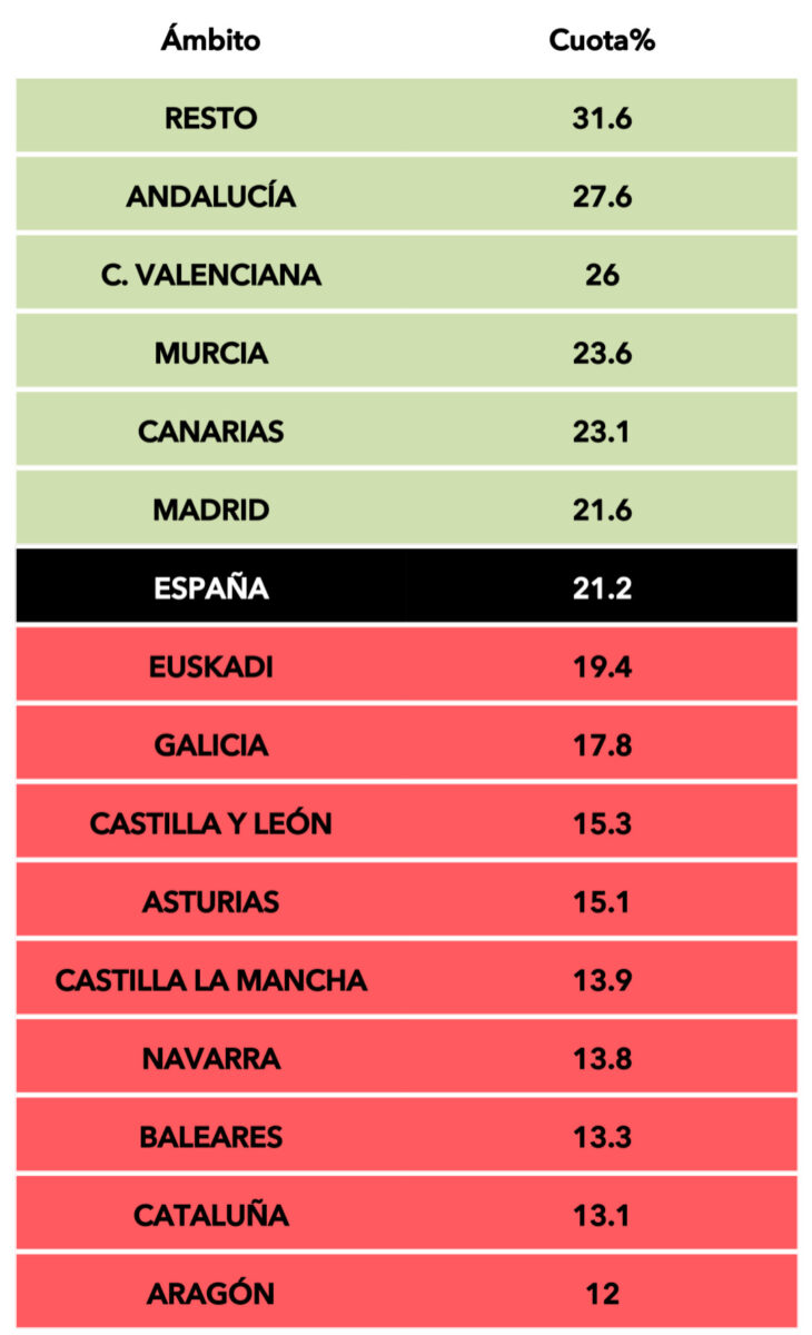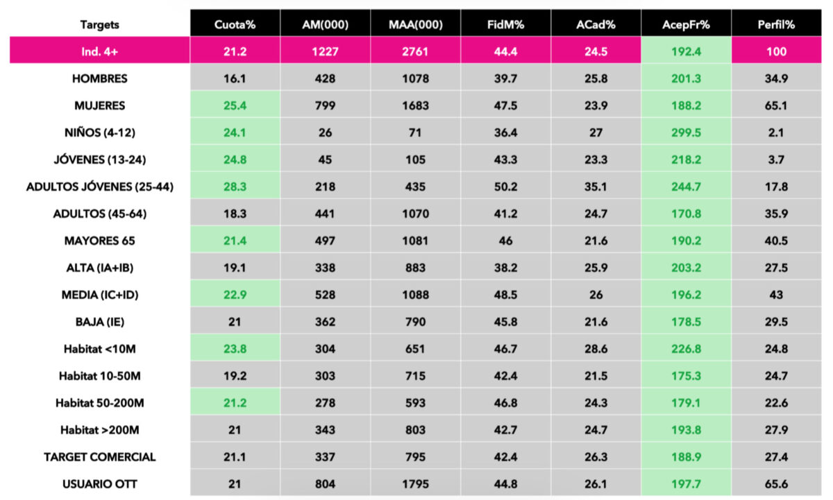 En primer lugar, por targets de edad, sobresalió en adultos-jóvenes con un 28,3%, en jóvenes con un 24,8% y en niños con un 24,1%. No obstante, su mayor volumen en espectadores procedió del público mayor de 65 años, con casi medio millón, lo que se tradujo en una cuota del 21,4%. En miles, otro de los segmentos de mayor aportación fue el adulto (45-64 años) con 441.000 (18,3%).