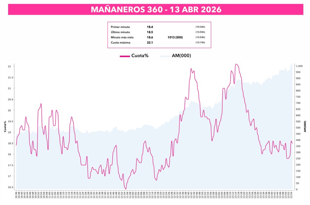 Y hacemos hincapié en el bloque conducido por Javier Ruiz porque la curva minuto a minuto -a la que hemos podido tener acceso gracias a un informe elaborado en exclusiva por la consultora Dos30'- refleja cómo 'Mañaneros 360' se disparó brutalmente entre las 12:00 horas, momento en el que el periodista recoge el testigo, y las 13:15 horas, con picos de cuota de pantalla superiores al 20%.