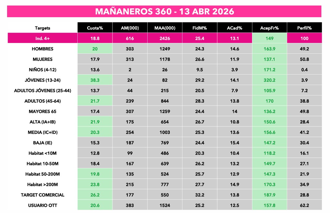 En cuanto a targets de edad, 'Mañaneros 360' arrolló en jóvenes de 13 a 24 años con un 38,3%. Aunque los segmentos de mayor aportación en miles, por cómo es el consumo de la televisión en la mañana, fueron los adultos (45-64 años) y los mayores de 65 años con un 21,7% y un 17,4% respectivamente; índices de share que se tradujeron en 239.000 y 307.000 telespectadores. Además, el target comercial escaló a un desorbitado 26,2%.
