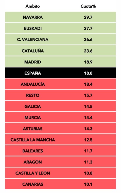 Por último, este análisis sobre el extraordinario rendimiento de 'Mañaneros 360' lo cerramos con las cifras por regiones. El programa de Javier Ruiz y Adela González se colocó por encima de la media nacional (18,8%) en Navarra, Euskadi, Comunidad Valenciana y Cataluña; los mejores mercados con un 29.7%, un 27.7%, un 26.6% y un 23.6% de cuota respectivamente. Destacables fueron también las métricas cosechadas en territorios tan importantes como Madrid (18,9%) o Andalucía (18,4%).