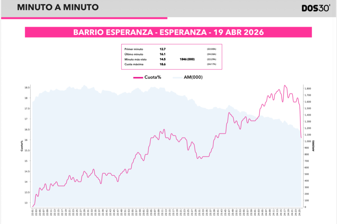 Volviendo a la extraordinaria acogida de 'Barrio Esperanza', una ficción que combina ese punto de comedia, emoción y compromiso social que ha cautivado al público, analizamos pormenorizadamente su rendimiento gracias a un informe elaborado en exclusiva por la consultora audiovisual Dos30'.