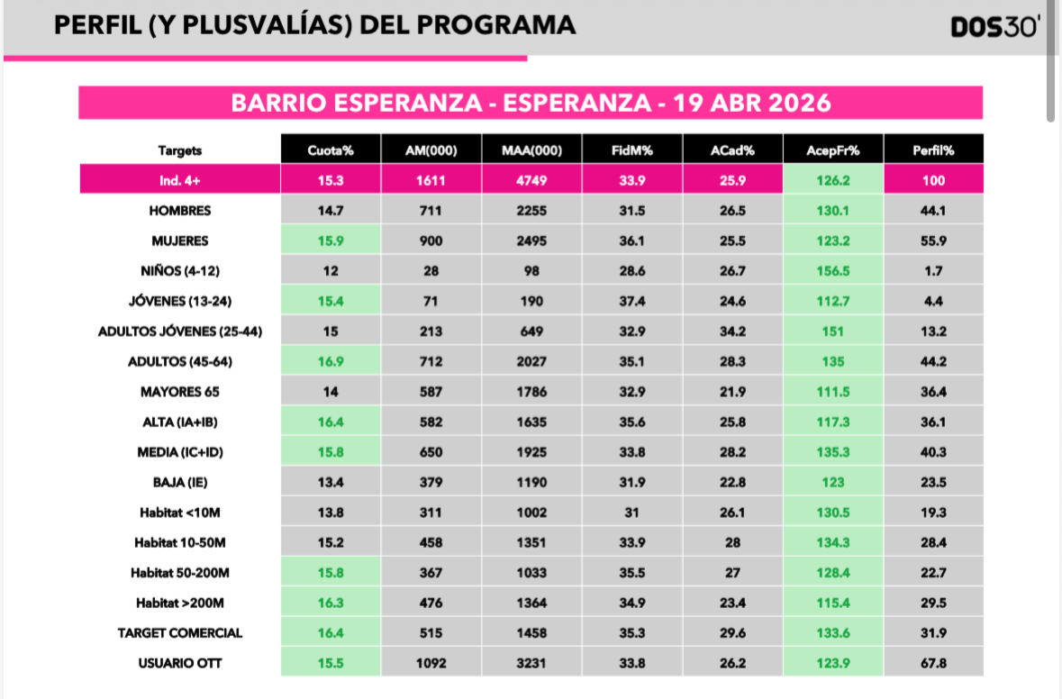 Por otro lado, respecto al perfil del público de 'Barrio Esperanza', firmó cifras relativamente parejas en hombres (14,7%) y mujeres (15,9%). En lo relativo al target por edad, lideró en todos los públicos de 4 a 74 años, sobresaliendo muy especialmente en jóvenes (13-24 años) con un 15,4% y en adultos (45-64 años) con casi un 17% de cuota.