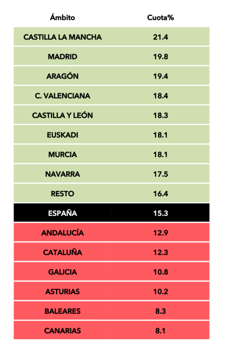 Por mercados, 'Barrio Esperanza' arrasó en Castilla-La Mancha (21,4%), Madrid (19,8%), Aragón (19,4%), Comunidad Valenciana (18,4%), Castilla y León (18,3%), Euskadi (18,1%), Región de Murcia (18,1%) o Navarra (17,5%). En todos estos territorios se situó notablemente por encima de la media nacional al igual que el denominado Resto (16,4%).
