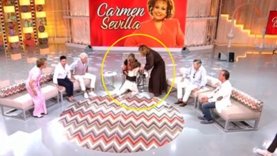 Una trabajadora de ‘Fiesta’ se caía al inicio del programa al correr para llevarse unas zapatillas con las que Terelu Campos había homenajeado a Carmen Sevilla.